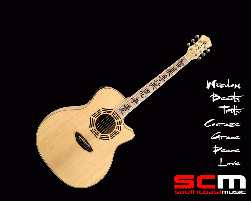 The maple fingerboard is hand inlaid with Rosewood calligraphy in the Zen credo that reads Wisdom, Beauty, Truth, Courage, Grace, Peace and Love. The sound hole rosette is a hand inlaid into the Solid Sitka Spruce top with Rosewoodthat reflects the Divine Bagua.