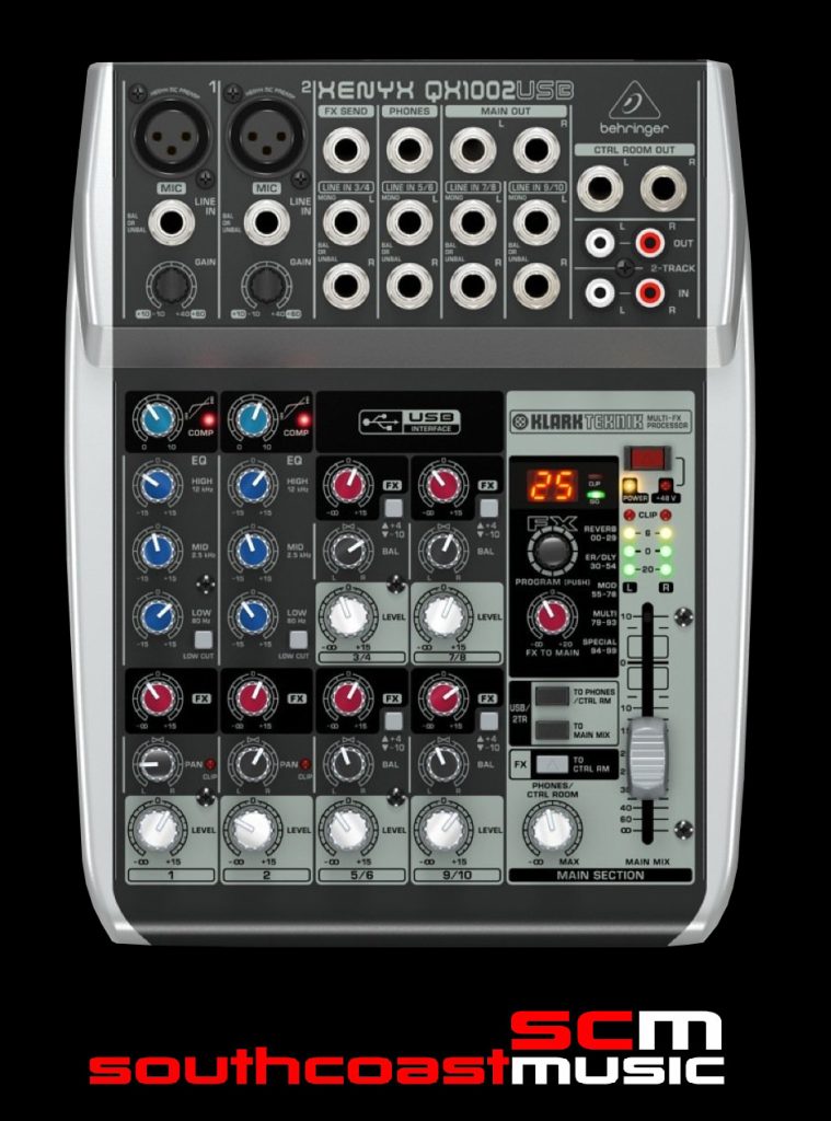 XENYX QX1002USBFrom classical to classic rock, the XENYX Q1002USB will bring out the best in your intimate performance or podcast. Mono channels feature two premium, phantom-powered XENYX mic preamps, famous for their headroom and transparency, plus “one-knob” compressors and 3-band British-style EQ. You also get 4 stereo line channels and USB connectivity for your PC or Mac computer. The QX1002USB is light, easy to use and ready to make your next show legendary.