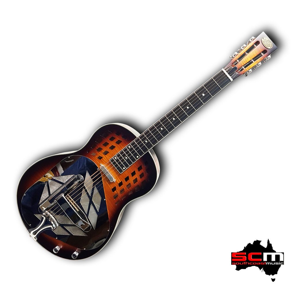 This is the Bourbon Street BSR-3C-W resonator acoustic electric guitar. This gorgeous guitar features a flame Maple body with a tri-cone resonator and passive single coil pickup.