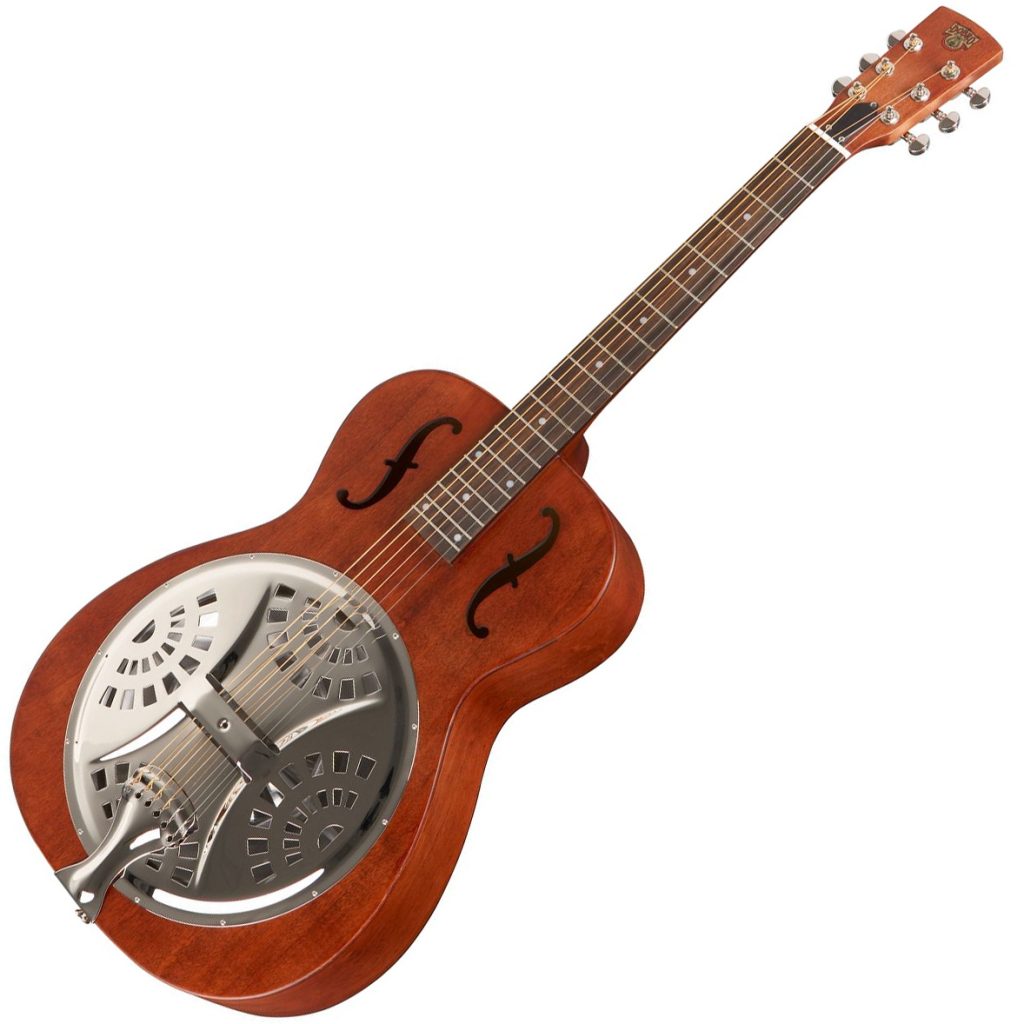 In addition to the bridges ebony saddle which sits atop a maple base, the full warm tone of the Hound Dog Round Neck is enhanced and projected by a new proprietary nickel plated Dobro cone with a nickel fan cover plate, round sound holes with screens, and classic f holes.