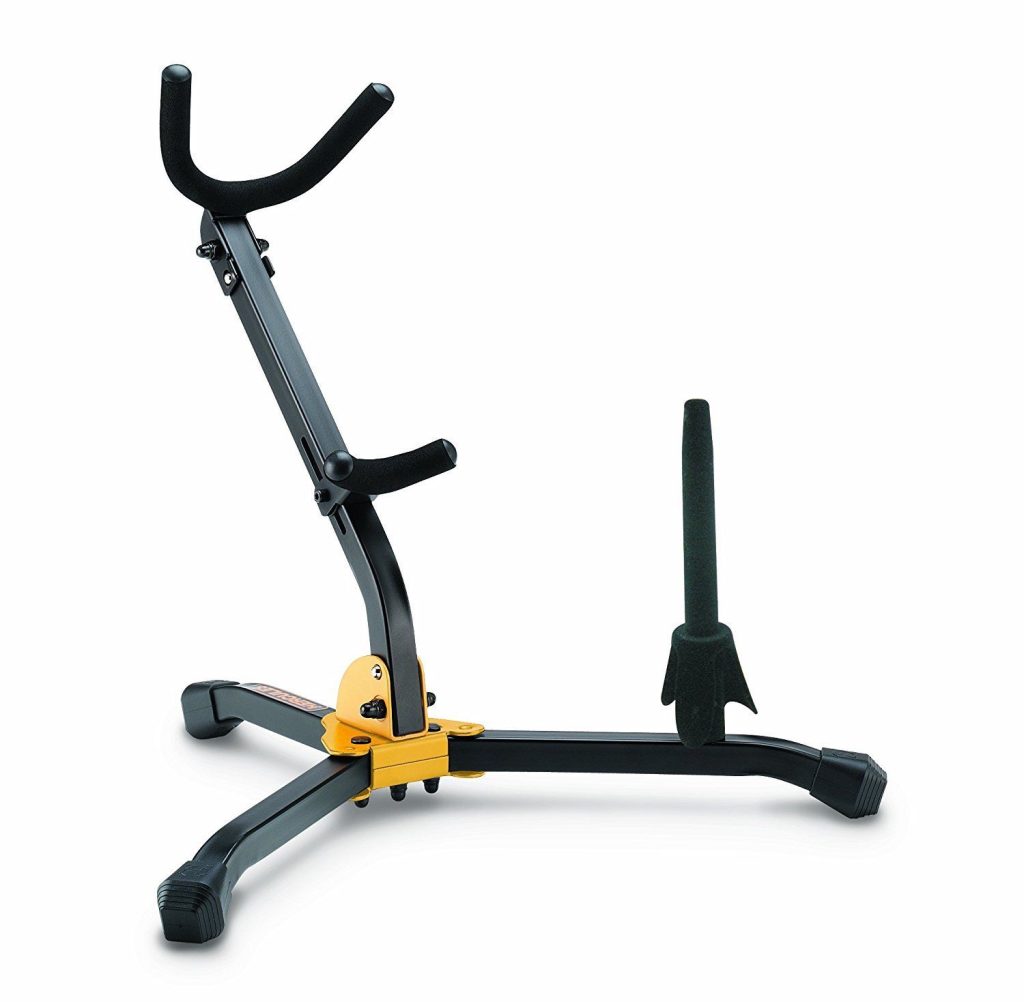 The HERCULES Saxophone and Flute/Clarinet Stand DS532BB features a folding yoke, an adjustable backrest, and locking pins that all safely and securely hold a Tenor or Alto Saxophone; includes an additional peg for either a Flute or Clarinet.
