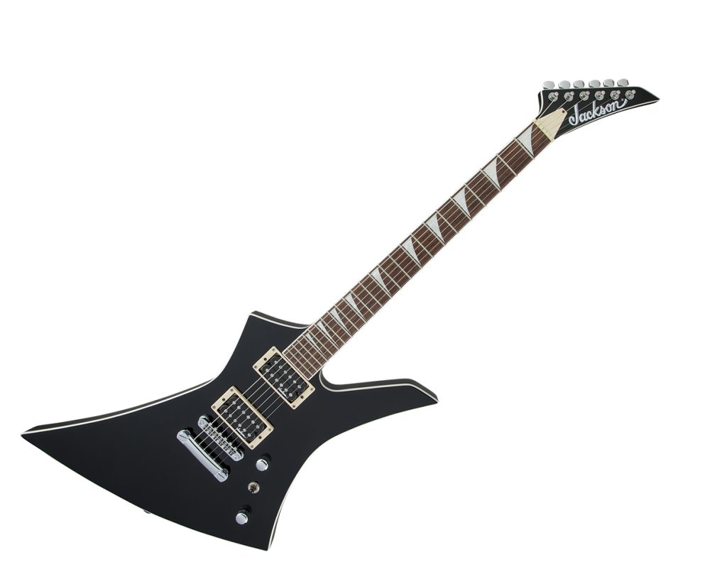 The KEXT is available in Gloss Black (chrome hardware) or Natural Mahogany (gold hardware) with single-ply white binding along the body, neck and Jackson pointed 6-in-line headstock.