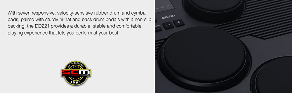 The DD221 features seven velocity-sensitive rubber drum and cymbal pads that offer excellent feel, rebound and response.