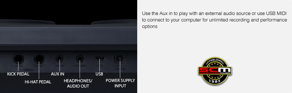 You can listen to the DD221 through the built-in stereo speakers. A Stereo Headphone output allows you to practice and play without disturbing others - you can also use the Headphone output to connect the DD221 to external amplification to fill the room with your performance. Use the Aux in to play with an external audio source or use USB MIDI to connect to your computer for unlimited recording and performance options.