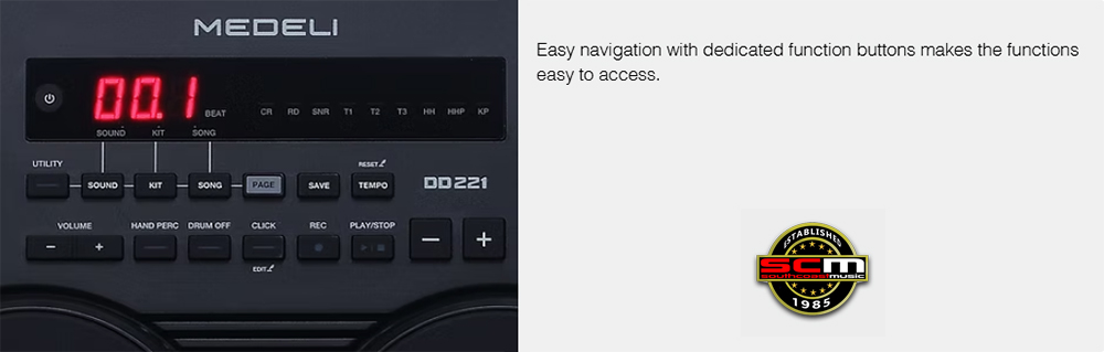 The Medeli DD221 Digital Drum kit offers the quality and features you need to perform, practice and record — and all at an affordable price. High quality digitally sampled sounds, songs with adjustable tempos and easy navigation with dedicated function buttons all add up to provide a unique solution for drummers and percussionists.
