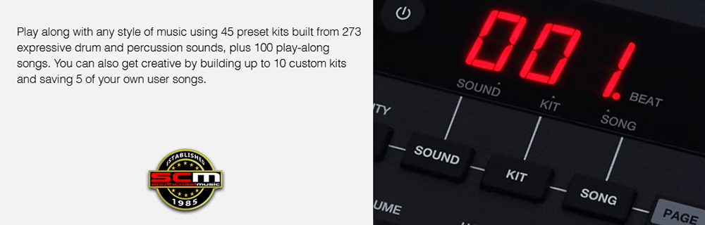 - 45 Preset Drum Kits & 10 Customisable User Kits