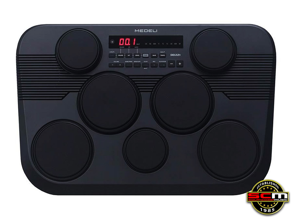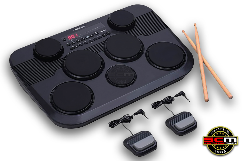 Enter the Medeli DD221.The Medeli DD221 is a compact and portable Digital Drum Kit, featuring 7 touch-sensitive pads and 2 pedals, equally at home on a table top or an optional stand. Please call us for more details about the stand.