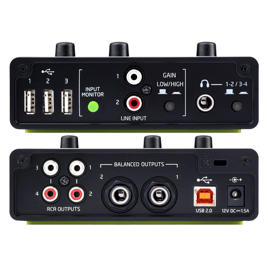 It has three USB 2.0 ports for bus-powering your whole setup, matched stereo inputs for sampling pristine audio and four line RCAs along with two balanced 6.35mm TRS jack outputs with studio quality sound.
