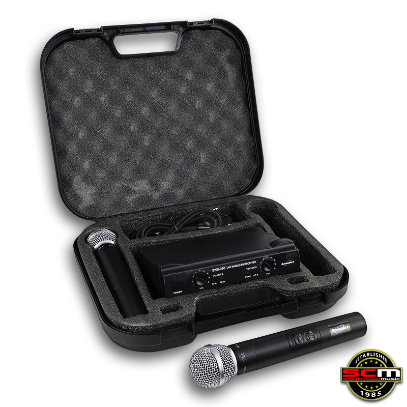 The SoundArt SWS-290-MM is a Dual Wireless Microphone System complete with two Handheld Wireless Microphones.
