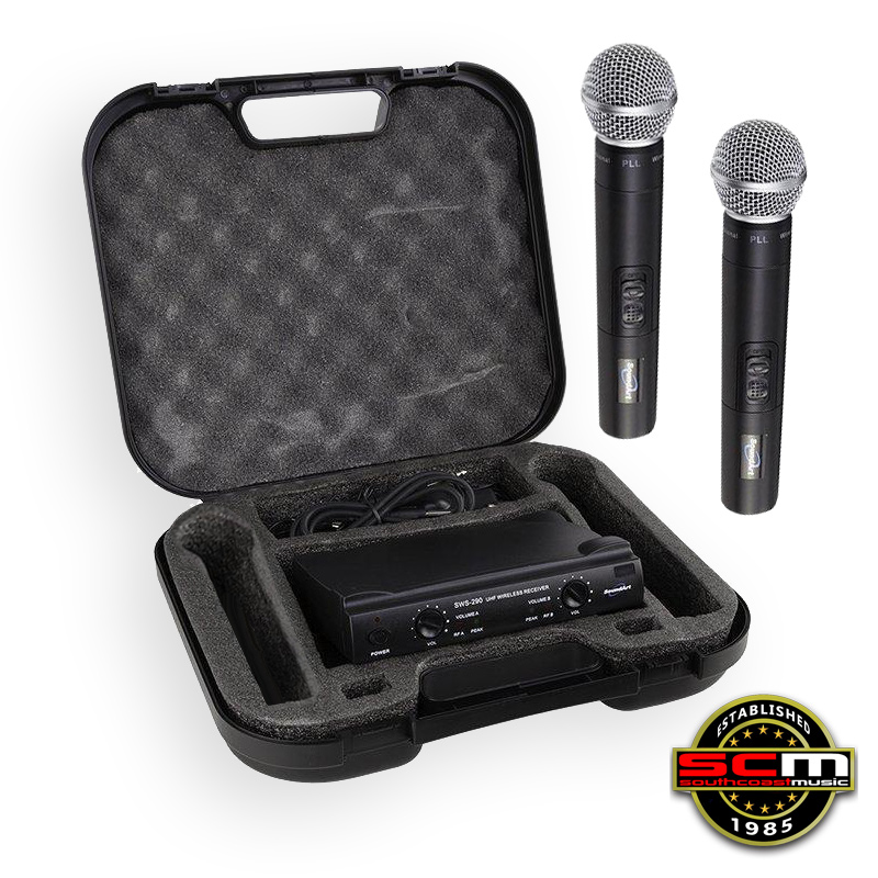 The SoundArt SWS-290-MM is a Dual Wireless Microphone System complete with two Handheld Wireless Microphones.