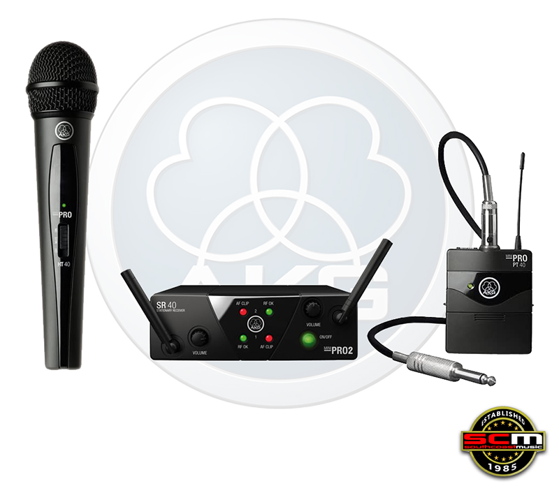 The system comprises an AKG SR40 Mini Dual Wireless Receiver with a HT40 Hand Held Microphone and PT40 Mini pocket transmitter.