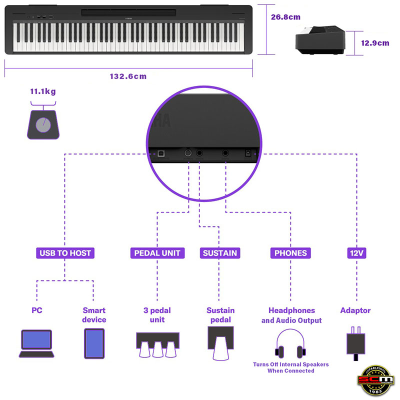 BONUS OFFER!Yamaha P145BT Digital Piano with the matching L100 Stand and LP5A Three Pedal Unit!• Newly developed Graded Hammer Compact (GHC) keyboard offers a realistic playing feel• 88 Weighted Keys• Yamaha CFIIIS Concert Grand Piano sound• 64 Note Polyphony• 10 Voices• Reverb• USB to host• Bluetooth® Audio Input• 6.35mm headphone/audio output• Dual Layers – layer two Voices• Simple one-button operation easy to use interface• Duo mode splits the keyboard into two halves, each with it’s own “middle C.”• ECO Operation saves energy by powering off after a period of inactivity• Balanced, clear sound• Practice with 303 free pieces of classical sheet music• Includes a music rest and sustain pedal• Easily record sound and video, and upload your own performances with the Rec’N’Share App• Compatible with Smart Pianist App• Light weight and portable – 11.1 kg!• Never needs tuning – ever!• INCLUDES the matching Yamaha L100 Stand and LP5A Three Pedal Unit!Newly developed GHC (Graded Hammer Compact) keyboard offers a realistic playing feelOne of the main concerns that piano players have when purchasing a digital piano is the feel of the keyboard when they play. Some of the issues that players are specifically concerned about include:• whether the keys feel like a weighted acoustic piano keyboard• whether the keyboard will respond accurately when they play quicker passages• whether there are any inconsistencies between how hard they play the keys and the sound that results• whether the keyboard offers a sufficient soft-to-loud dynamic range.Yamaha’s previous P Series digital pianos have received high praise from customers for the excellent balance and feel offered by the GHS keyboards.Compared to its predecessor, the all-new P-145BT features a much shorter and slimmer body design with a simple yet more modern , compact style – without compromising the playing experience. The newly developed Graded Hammer Compact (GHC) 88-note keyboard is built to the highest standards and offers the same weighted acoustic piano-like playing feel as the GHS (Graded Hammer Standard) keys used in previous models of the P Series.Adjustable Touch Sensitivity – Regulation with the press of a button!Pianists will appreciate a regulated piano action. Whether experienced or a beginner, it means a piano that feels, performs and responds to their playing style.Regulating a piano can result in a touch that is soft, with little effort required to make a sound or, hard with a broad dynamic range. The volume level changes very widely from pianissimo to fortissimo, facilitating greater dynamics and dramatic expression.Regulating an acoustic piano is time consuming and, can be expensive.You can change the touch sensitivity of the P-145BT easily from the front panel or with a Smart device by using the Smart Pianist app.Touch Sensitivity Settings:1) Soft: The volume level does not change much when you play the keyboard soft or hard.2) Medium: This is the standard piano touch response (default setting).3) Hard: The volume level changes very widely from pianissimo to fortissimo to facilitate dynamic and dramaticexpression. You have to hit the keys hard to produce a loud sound.4) Fixed: The volume level does not change at all regardless of whether you play the keyboard soft or hard. This is set for the pipe organ and harpsichord voices.Offering the sound of a full grand pianoThis model features the sound of a Yamaha full concert grand, the CFIIIS: the origin of Yamaha’s premier concert grand pianos, the CFX.The sound was sampled from a piano with a bright, transparent tone with a spacious treble and an overall solid sonic feel.In addition, the P-145BT features a damper resonance function that reproduces the rich resonance sound you hear when pressing the damper pedal, for an even fuller sound. The P-145BT comes supplied with a damper/sustain pedal/footswitch.We hope that you will enjoy the profoundly deep character of this instrument’s sound, so characteristic of that of a real grand piano. It goes without saying that this instrument doesn’t require tuning.Place the instrument wherever you like, or even take it with youOne trouble that plagues pianists is that the acoustic piano is not an instrument you normally carry with you wherever you go.Another issue is that traditional pianos are often too large to fit into a room. The P-145BT provides a brilliant solution to these problems. With its stylish design, this compact model blends well with the decor of any room.With the optional soft case, you can take the P-145BT with you to the studio, to a party, to live gigs, or on a trip—whenever you need it.Access the features of this instrument with greater ease from the appBy linking the P-145BT with Yamaha’s dedicated “Smart Pianist” digital piano app, you can intuitively perform all operations on the P-145BT from the screen of your smart device. There’s no longer any need to pull out the manual to see how things work.*When connecting a smart device to a musical instrument to use the app, you can either use a cable or connect wirelessly using the Yamaha UD-BT01 (sold separately; for iOS only).Minimalistic design featuring only carefully selected functionalityThe P-145BT is a design that perfectly embodies the expression, “less is more.” Most people who love playing the piano as their instrument don’t want a lot of rarely used features. The P-145BT offers a simple, modern form factor to meet the needs of such people.Balanced, clear soundThe position and angle of the speakers on the back of the P-145BT have been adjusted to replicate the sounds reflected from the soundboard and lid of an acoustic grand piano as closely as possible. These adjustments let you enjoy playing with sharp and clear mid- to high-range tones and a prominent low-end for a well-balanced sound, even when the P-145BT is set up against a wall.Practice with 303 free pieces of classica
